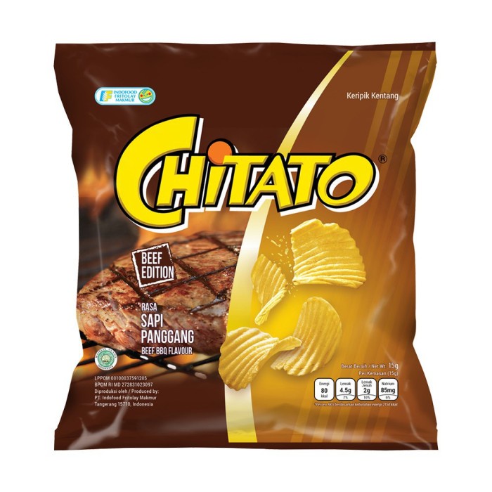 Chitato Sapi Panggang merupakan makanan ringan yang terbuat dari kentang pilihan. Tekstur potato chips tipis-bergelombang dengan perpaduan bumbu sapi panggang yang lezat, gurih, dan renyah.