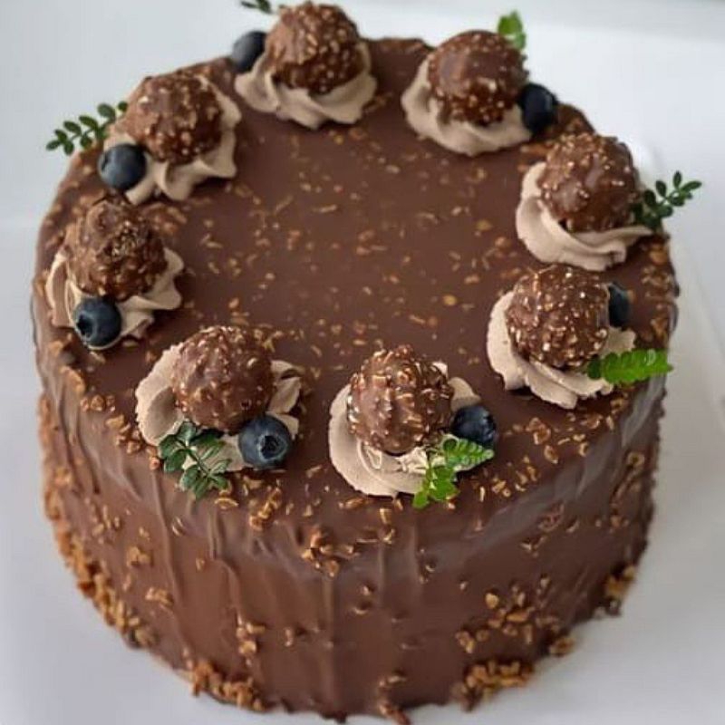 Kue Tart Coklat berlapis, yang dilapisi butter krim coklat leleh, dan remah kacang dalam rasa mocca, serta hiasan biskuit bola coklat diatasnya