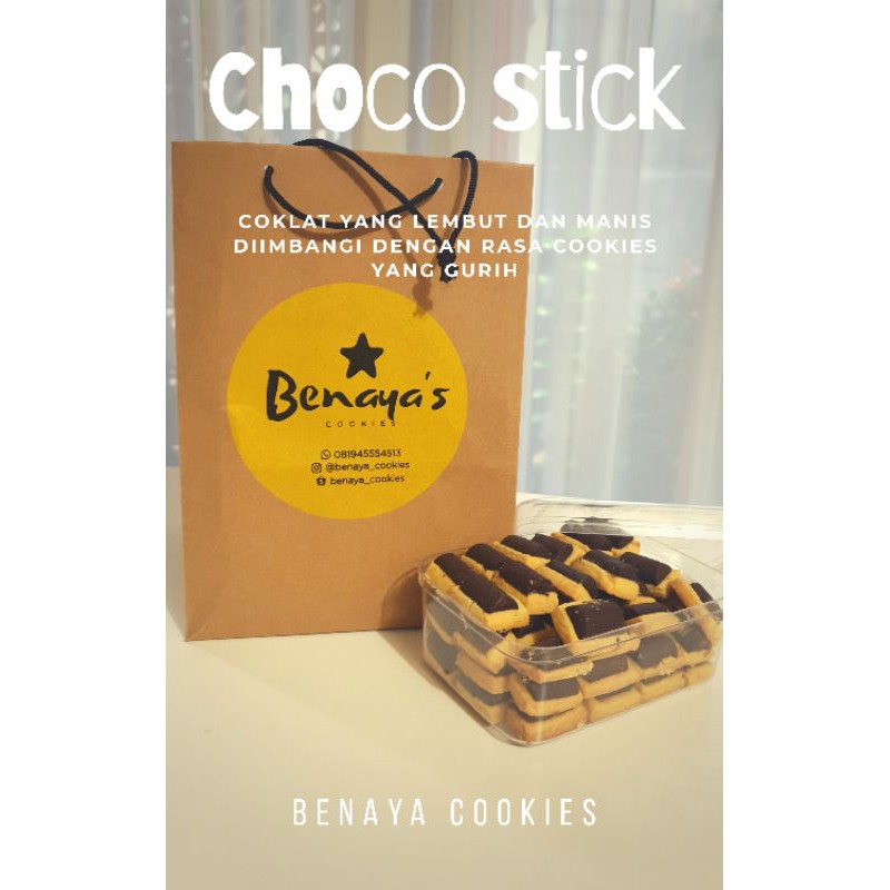 Choco Stick dari Benaya's Cookies kaya akan coklat yang yumiii banget dibuat dengan penuh cinta , higienis dan Halal. Dibuat oleh tenaga profesional yang hobby membuat aneka kue kering/cookies , serta menggunakan bahan² yang premium tentunya..