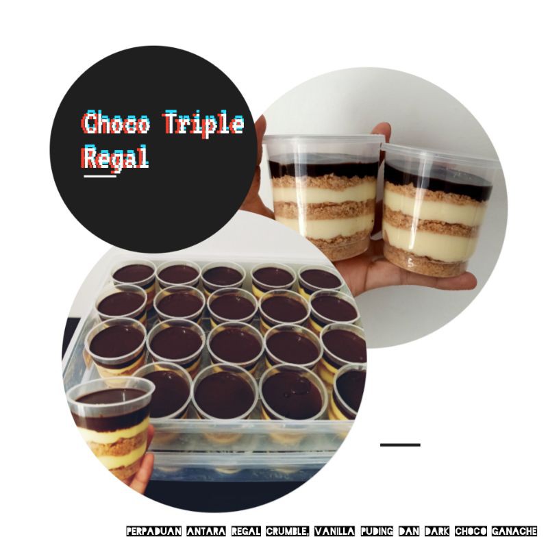 Perpaduan biskuit marie regal, vanilla puding dan dark coklat ganache, bikin lidah kamu manja ketagihan deh sm si choco triple regal ini. per cup ukuran 150ml.