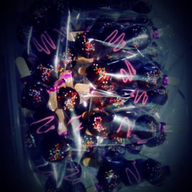 Biskuitt egg dropp yang dibalut dengan cokelat ,,ditabur dengan sprinkle