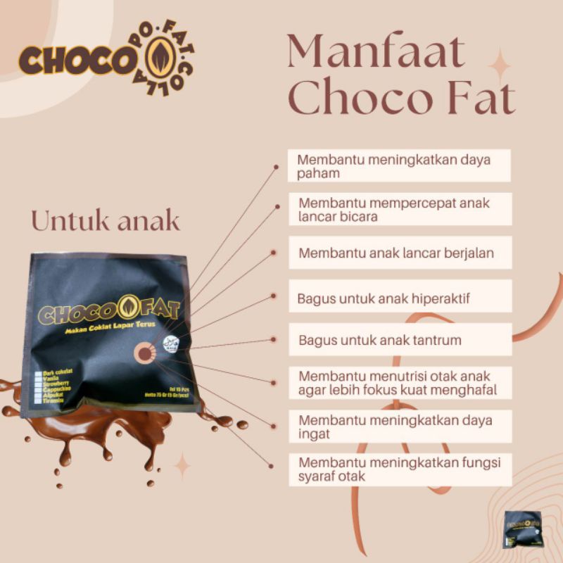 chcofat adalah cokelat compound varian rasa dengan campuran bahan dasar rempah-rempah asli Indonesia ditambahkan madu, propolis yang baik untuk kesehatan anak dan dewasa serta membantu menaikan nafsu makan.