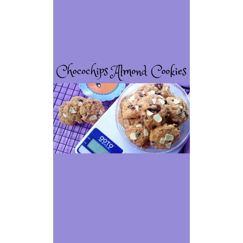 Cookies dengan campuran margarine, gula palm. chocochip dan almond slice.