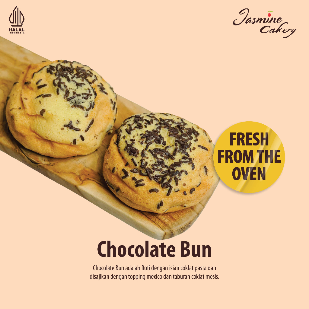 Salah satu varian roti yang digemari oleh Sahabat Jasmine adalah Chocolate Bun. Chocolate Bun adalah Roti dengan isian coklat pasta dan disajikan dengan topping mexico dan taburan coklat mesis.