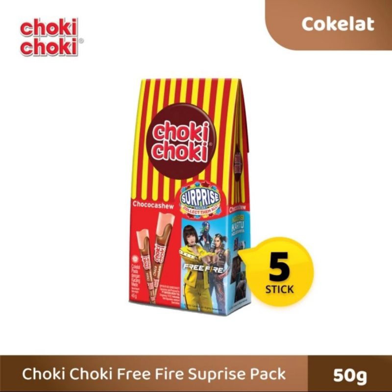 Choki-Choki Free Fire Surprise Pack,terbuat dari coklat berkualitas dan susu krim dalam format pasta coklat. Kenikmatan yang menyenangkan yang mengerti anak-anak. Stick coklat dengan perpaduan rasa cashew yang sangat digemari.