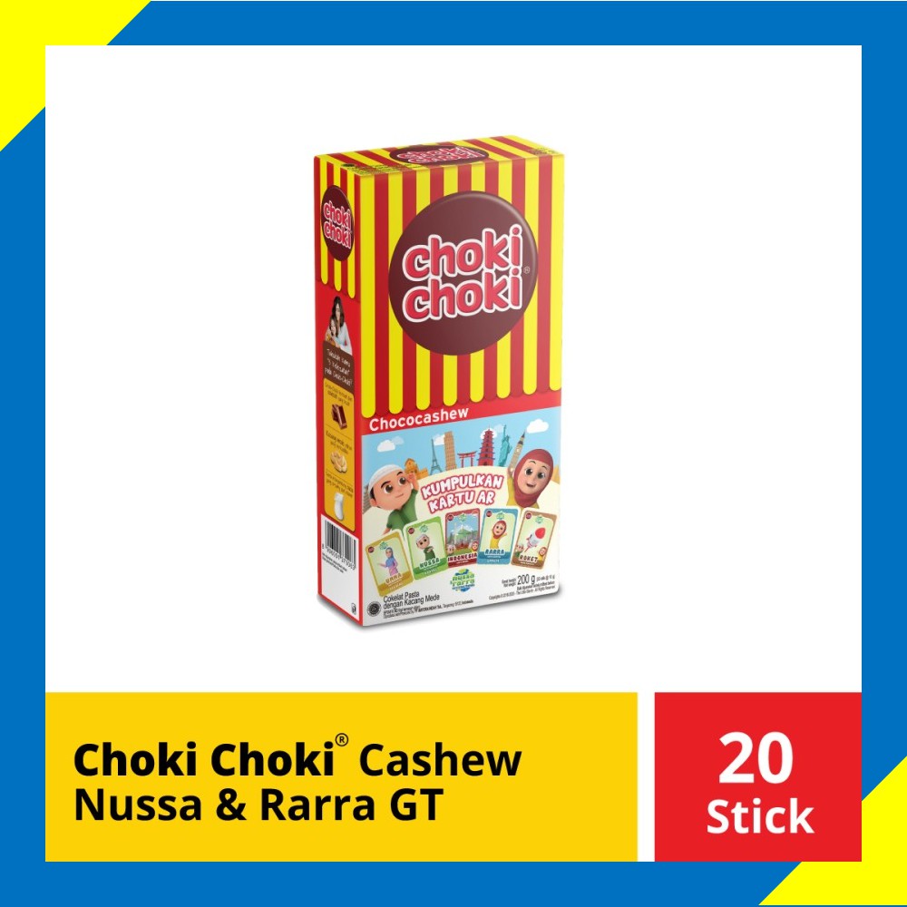 Choki-Choki Cashew Edisi Nussa dan Rarra GT , Choki-Choki hanya terbuat dari coklat berkualitas dan susu krim dalam format pasta coklat. Kenikmatan yang menyenangkan yang mengerti anak-anak. Stick coklat dengan perpaduan rasa cashew yang sangat digemari.