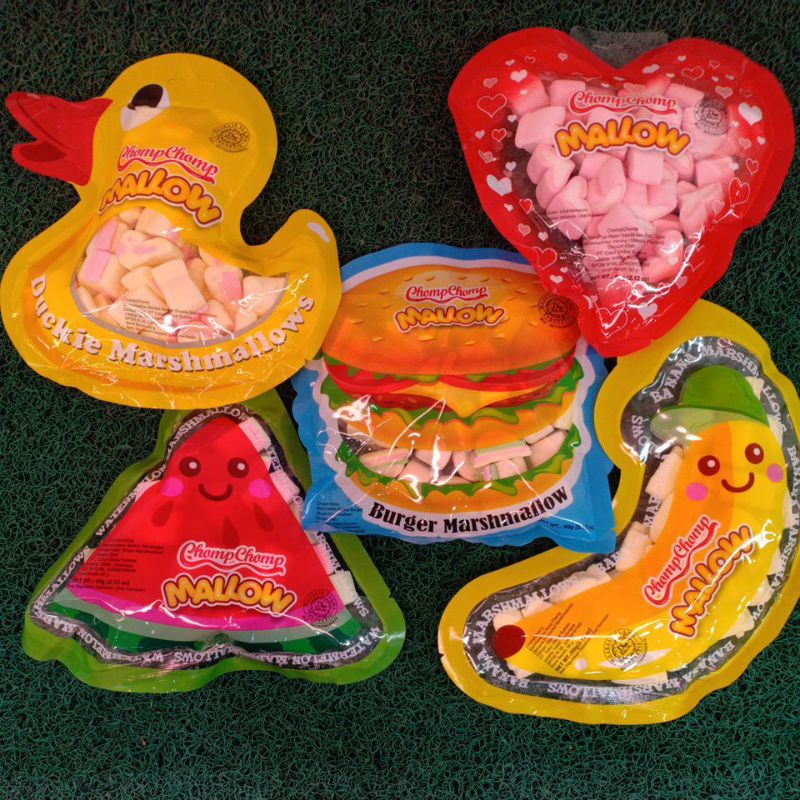 Chomp Chomp Mallow, marsmallow berbentuk bebek, semangka, burger, pisang (rasa pisang) dan love (rasa vanila dan matcha)