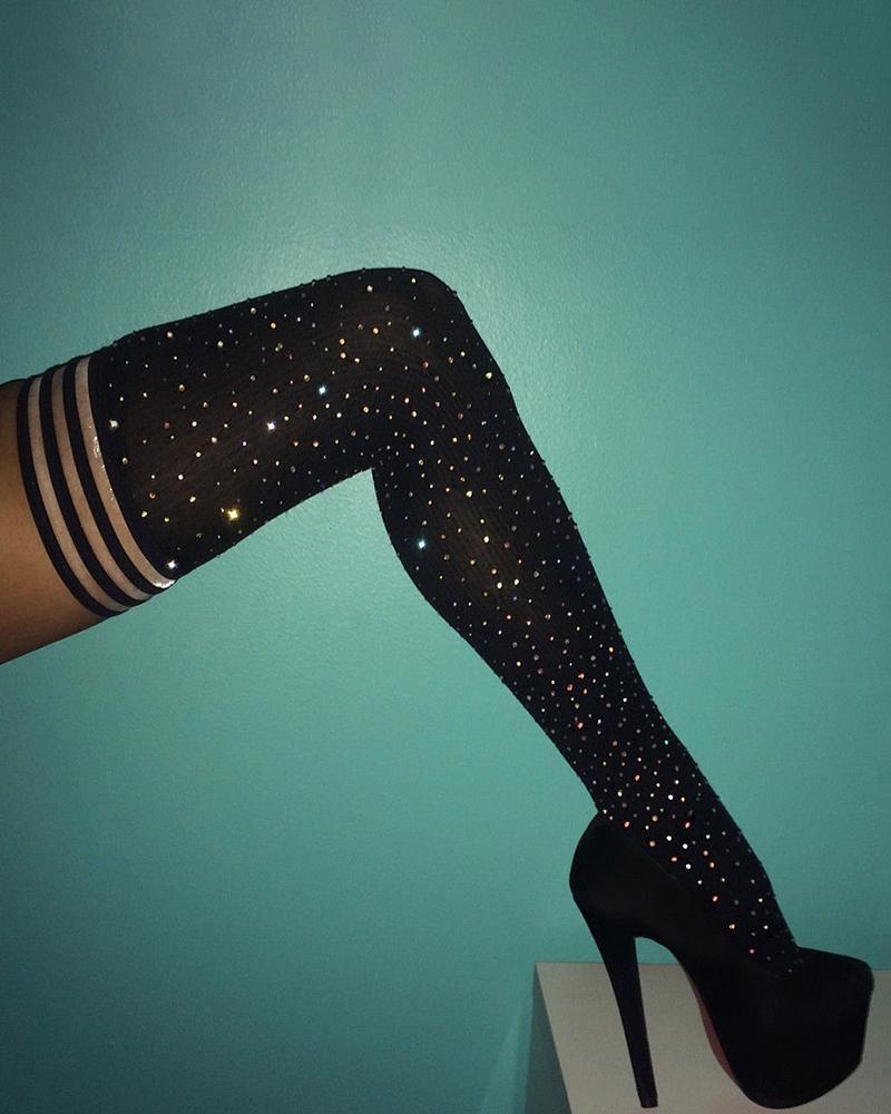 Christmas Striped Print Rhinestone Decor Long Socks, Black