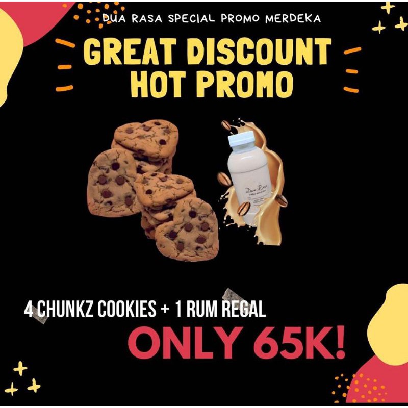 PROMO HEMAT MURAH! Yuk rasakan nikmatnya Chunkz Cookies dengan Minuman Rum Regal yg akan menggoyang lidah kamu nih! Pas bgt buat nemenin hari hari kamu!! PROMO hanya sampe akhir Agustus!