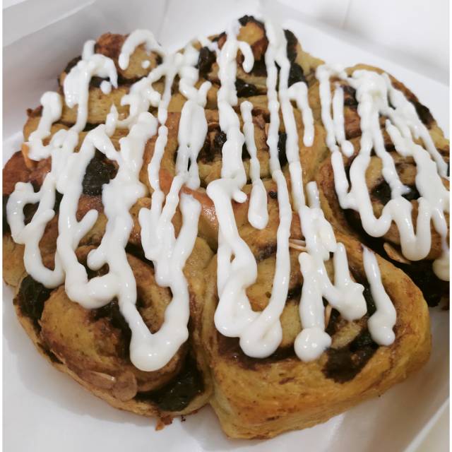 Roti cinammon roll dengan rasa original toping cream cheese atau mocca dengan toping cream cheese meses