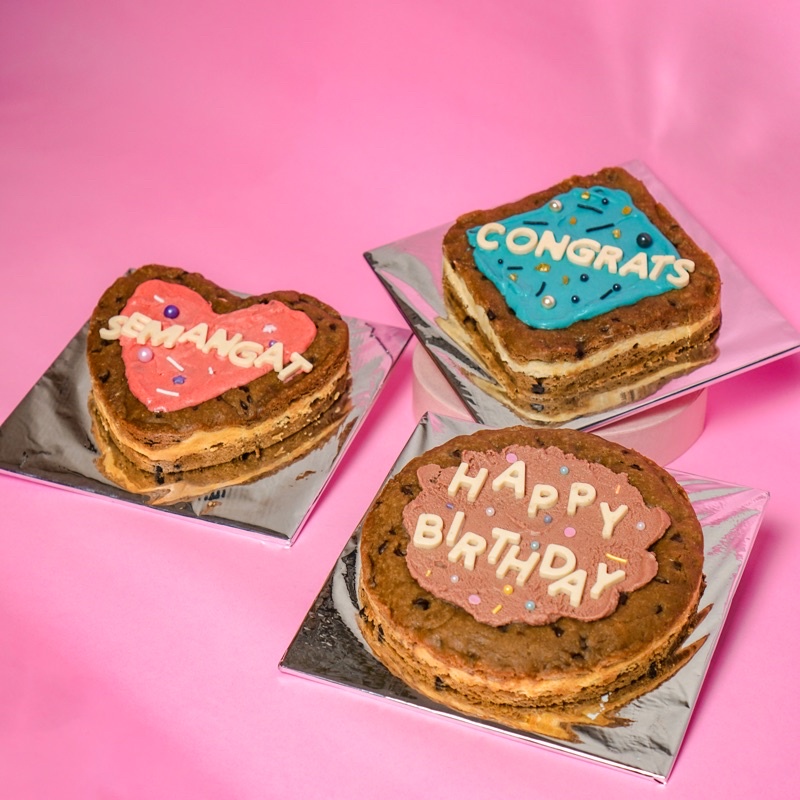 Cookie cake dengan cream cheese filling diantara original chocolate chip cookie layers.