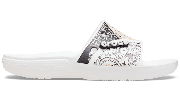 It’s everything you love about the Crocs Classic Clog in Slide form. And this version features street-inspired bandana print graphics. Each slide has room for 13 charms so you can load up your sandals with tons of personality. Original Croslite™ foam cushion will keep you comfortably supported as multi-color bandana graphics boost your style. Classic Crocs Bandana Slide Details: • Stylish bandana print graphics • Incredibly light and fun to wear • Easy to clean and quick to dry • Customizable with Jibbitz™ charms • Iconic Crocs Comfort™: Lightweight. Flexible. 360-degree comfort.