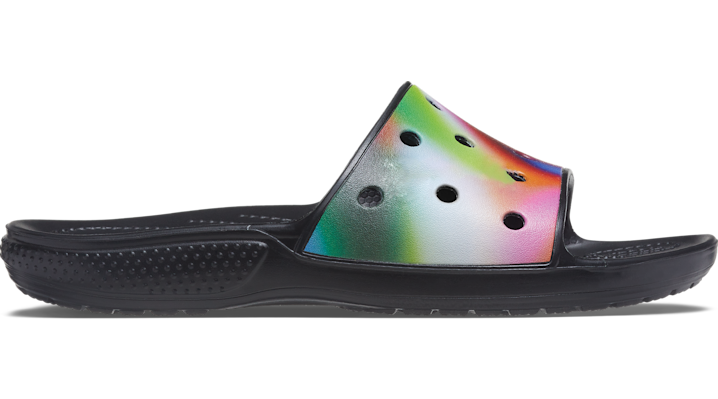 It’s everything you love about the Crocs Classic Clog in Slide form. Each slide has room for 13 charms so you can load up your sandals with tons of personality. Original Croslite foam cushion will keep you comfortably supported as fun, bright graphics boost your style. Classic Crocs Solarized Slide Details: Fun, solarized graphics on the uppers Incredibly light and fun to wear Easy to clean and quick to dry Customizable with Jibbitz charms Iconic Crocs Comfort: Lightweight. Flexible. 360-degree comfort.