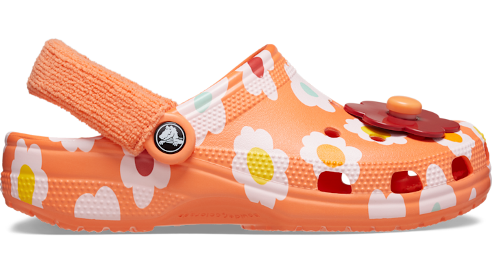A colorful floral graphic, terry cloth backstrap and spinner flower Jibbitz™ charms provide extra style to this version of the iconic clog. The fun graphic and charms helps you show off your creative spirit, the terry cloth backstrap adds more style and comfort, and the Croslite™ foam Classic Terry Cloth Clog Details: • Colorful floral graphic • Terry cloth backstrap • Includes Spinner Flower Jibbitz™ charms • Incredibly light and fun to wear • Ventilation ports add breathability and help shed water and debris • Pivoting heel straps for a more secure fit • Customizable with Jibbitz™ charms • Iconic Crocs Comfort™: Lightweight. Flexible. 360-degree comfort.
