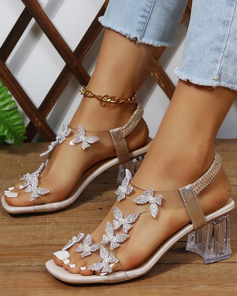 Clear Strap Rhinestone Butterfly Pattern Chunky Heels, Gold