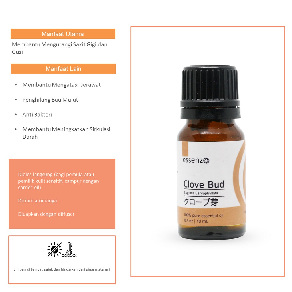 • jika baru menggunakan pertama kali, dilute/campurkan 2-3 tetes clove bud oil pada kurang lebih 10ml carrier oil (contoh : virgin coconut oil), kemudian oleskan