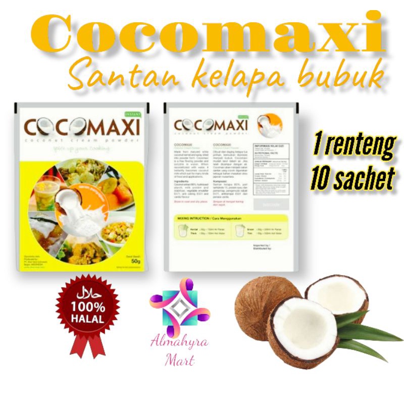 Cocomaxi adalah Santan Bubuk yang dibuat dari daging kelapa tua pilihan. Cocomaxi merupakan santan bubuk yang sangat digemari oleh masyarakat dikarenakan cocomaxi dapat bertahan lama, cara pemakaiannya sangat mudah, dan harganya juga terjangkau. Diproses menggunakan mesin Spray Dryer Tower dengan teknologi terkini, terciptalah Cocomaxi, Santan Bubuk yang mudah larut jika di campur dengan air. Dengan kemasan sachet 25gr, yang setara dengan 1/4 butir kelapa.