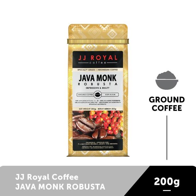 Kopi JJ Royal Java Monk Robusta menggunakan biji kopi premium yang ditanam dan dipanen oleh para biarawan di dataran tinggi yang tenang di sebuah kawasan biara di Jawa Tengah. Jenis kopinya menghasilkan aroma malt dengan sedikit aroma cokelat yang mengesankan; Pengalaman langka, kaya dan menyenangkan dapat anda nikmati di setiap cangkir Kopi JJ Royal Monk Robusta