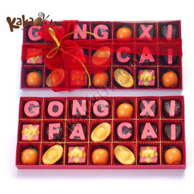 Cokelat praline dengan isian, dengan text Gong Xi Fa Cai disertai hiasan2 tema Imlek.