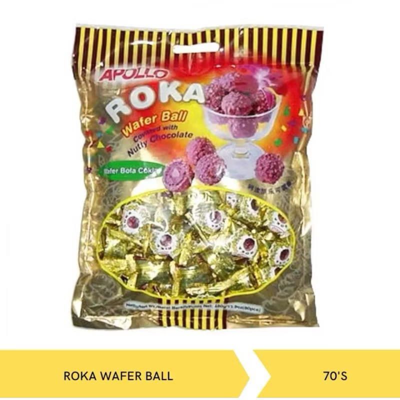 APOLLO Roka Wafer Bola Coklat, cemilan wafer bentuk bola dengan rasa coklat lezat dan manis alami cocok menemani anda saat bersantai bersama keluarga.