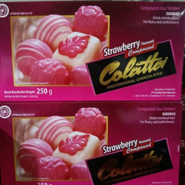 Colatta compound strawbery adalah coklat batang yang berwarna pink/merah mudah dan berasa strawbery, Sangat cocok untuk bikin permen coklat praline siram roti-cokies dll