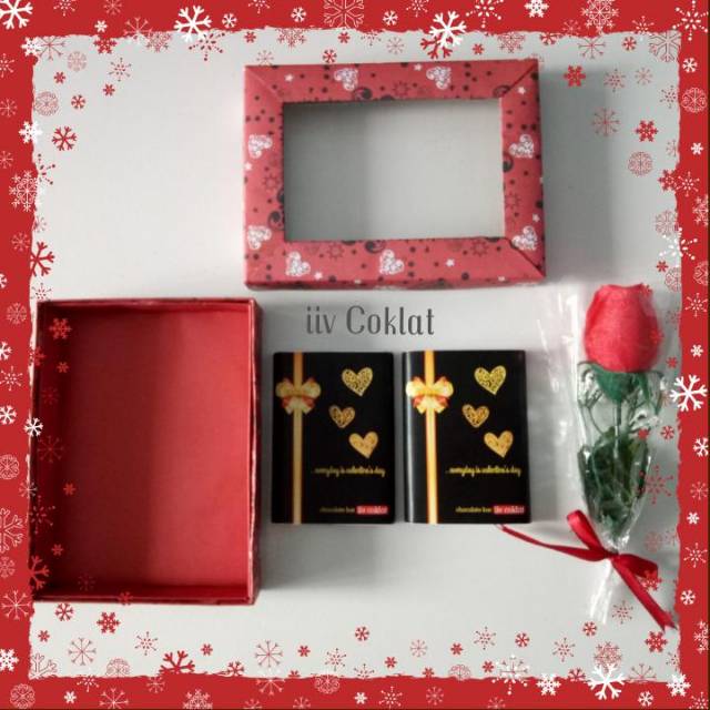 Dalam 1 box manis ini kamu bisa dapatin 2 (dua) coklat bar isi kismis (varian Dark & Milk) plus setangkai bunga mawar lho.