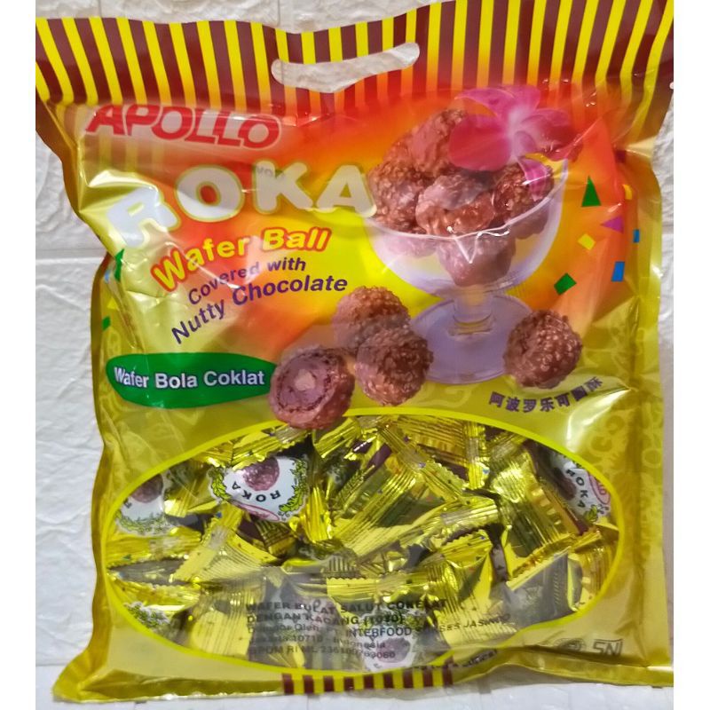 Apollo roka Wafer Ball isi 50 pcs. Bola cokelat lapis kacang yang enak. Cocok untuk camilan maupun oleh-oleh. Produk Malaysia Halal.