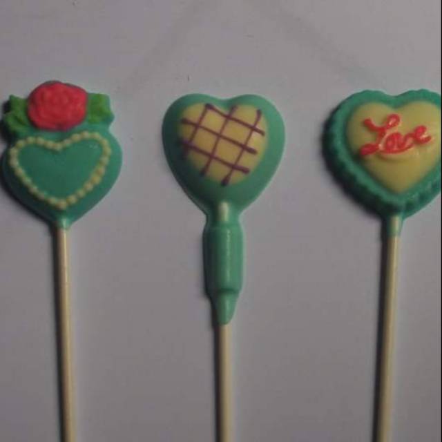 ukuran produk D 4,5 cm × T 1.3 cm standard cetakan coklat, panjang stick 13 cm, kemasan plastic + pita
