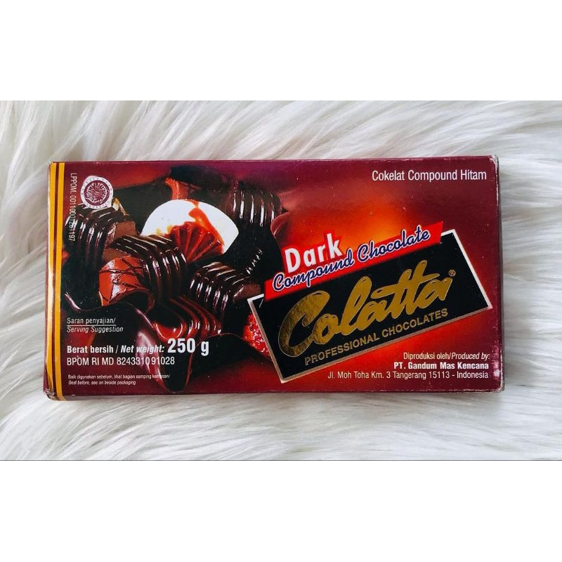 Colatta Dark Compound adalah cokelat compound dengan rasa cokelat yang pekat dan memiliki kemampuan untuk tetap mengkilap meskipun dipanaskan berulang kali. Cokelat ini cocok untuk berbagai aplikasi seperti hiasan kue, dicetak, diserut, serta sebagai bahan isian. Cokelat ini juga mudah digunakan tanpa perlu proses tempering