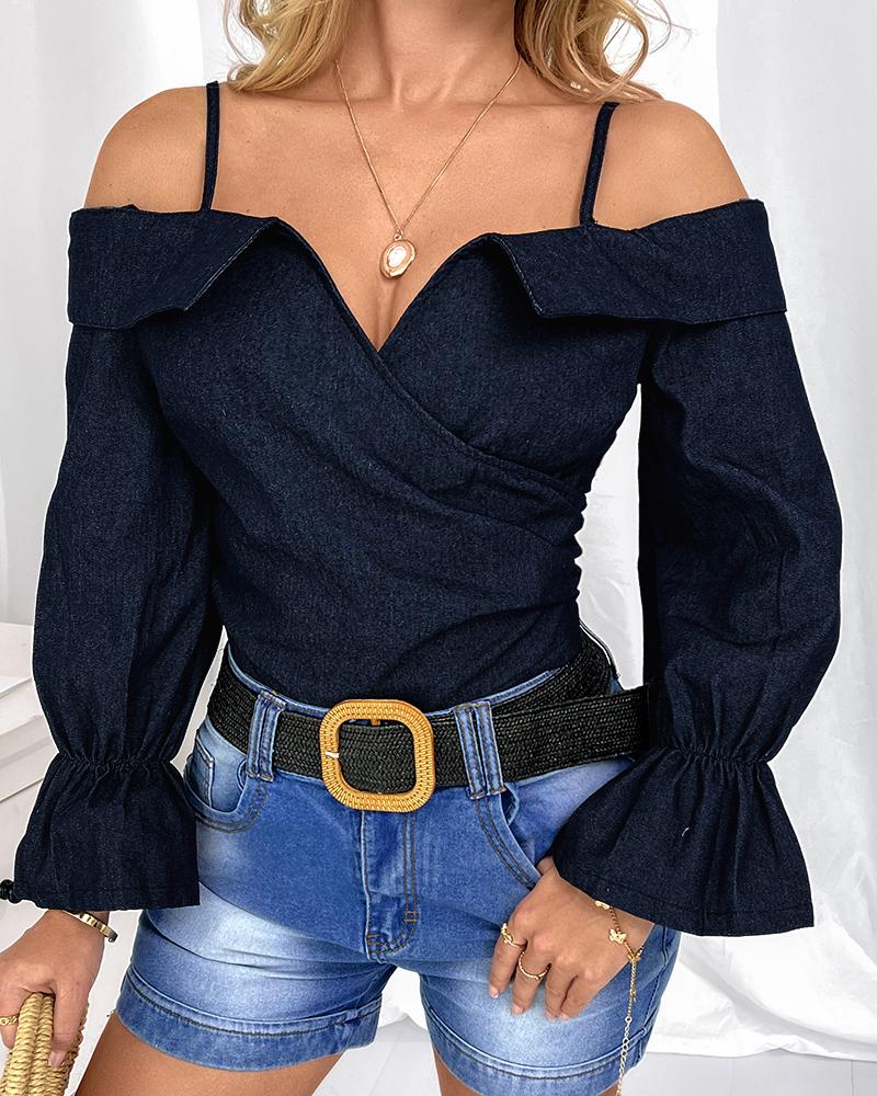 Cold Shoulder Notch Neck Flared Sleeve Top, Blue