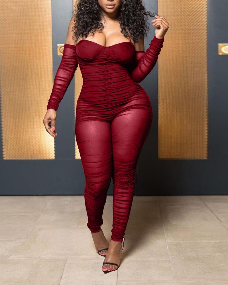 Cold Shoulder Ruched Sheer Mesh Jumpsuit, Wine red