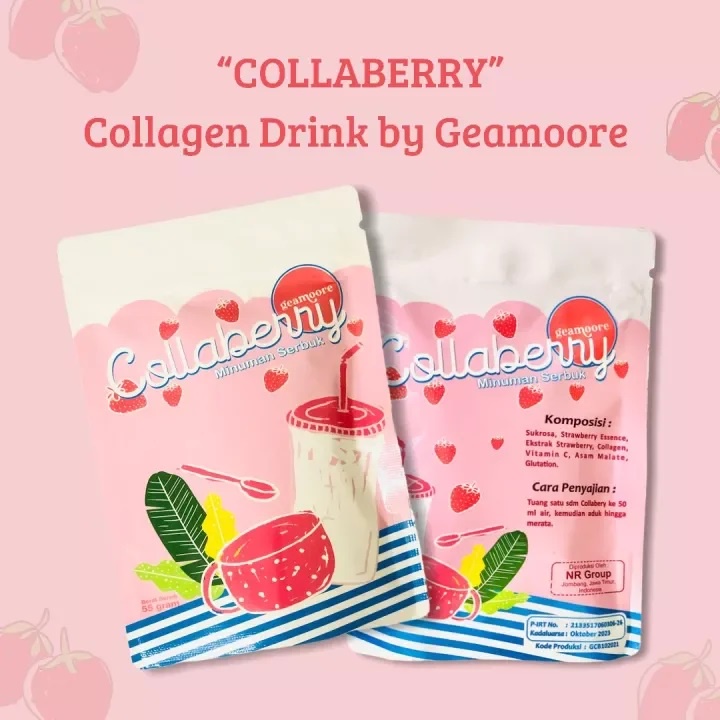 Colagen Drink dari Geamoore dengan rasa starwberry dan sudah lolos BPOM dan aman dikonsumsi. Dapat diseduh 10x, tuang 1 sdt collaberry ke 100 ml air.