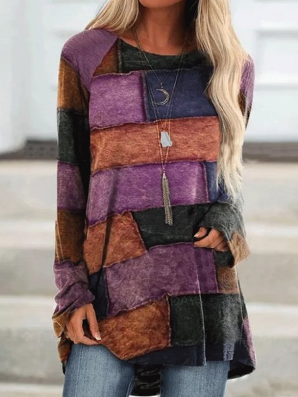 Color Block Print Raglan Long Sleeve Round Neck T-shirt
