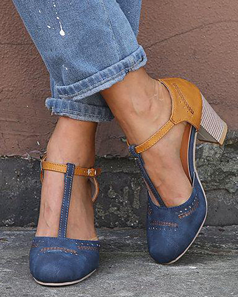 Colorblock Ankle Buckled Chunky Heels, Blue