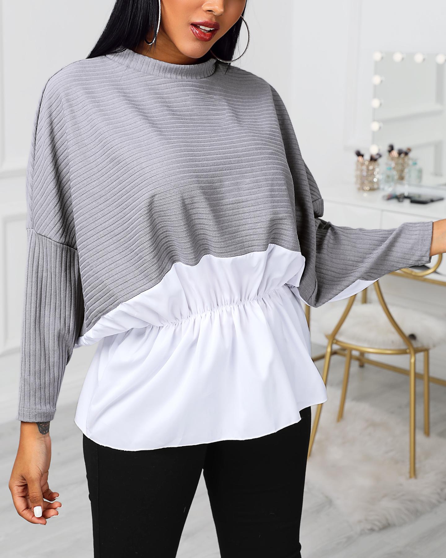 Colorblock Insert Ruffles Ribbed Batwing Sleeve Blouse, Gray