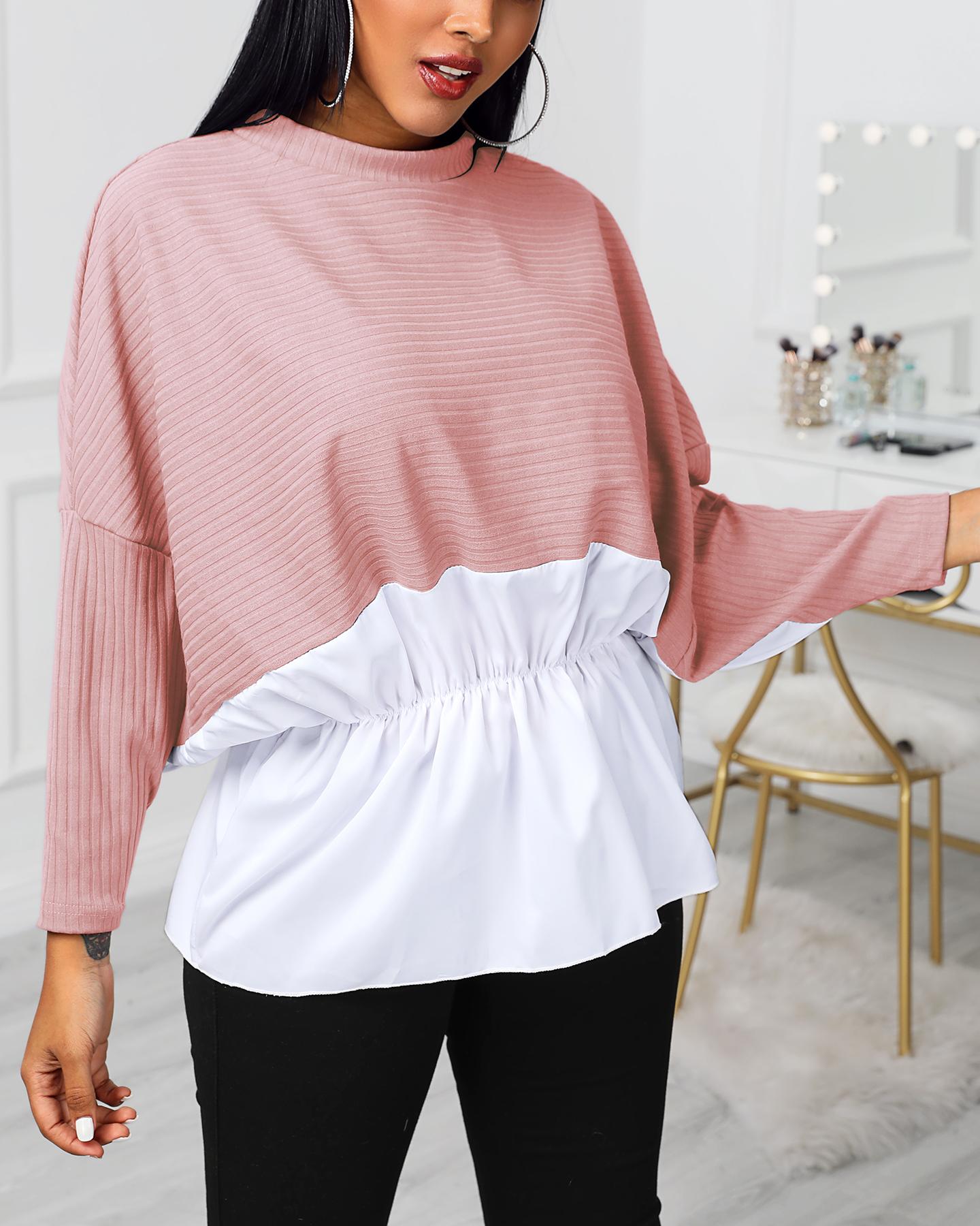 Colorblock Insert Ruffles Ribbed Batwing Sleeve Blouse, Pink