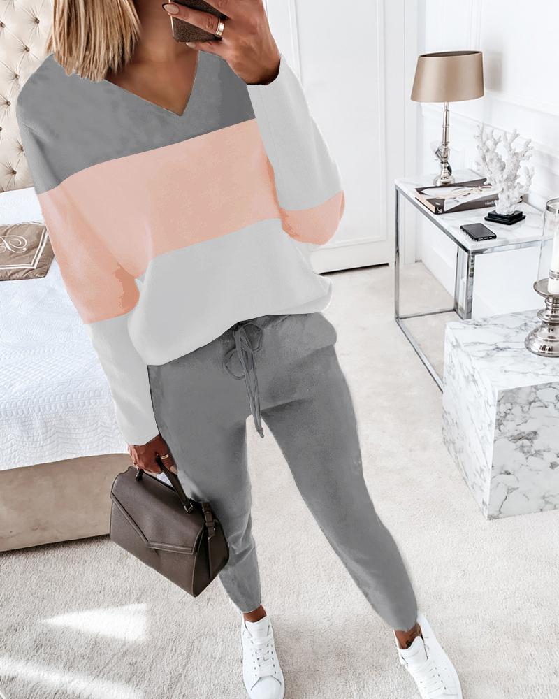 Colorblock Long Sleeve Top & Drawstring Pants Set, Gray