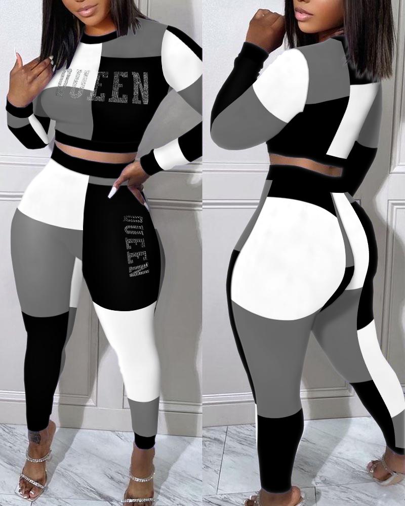 Colorblock Rhinestone Letter Pattern Crop Top & Pants Set, Black