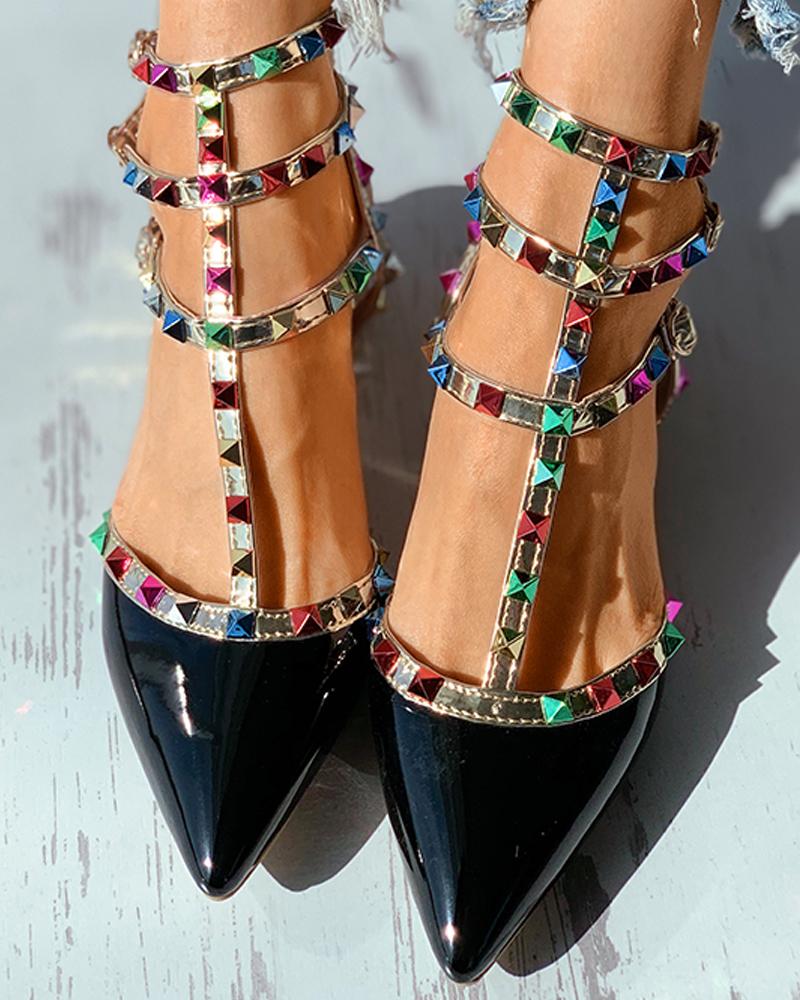 Colorblock Rivet Pointed Toe Chunky Heels, Black