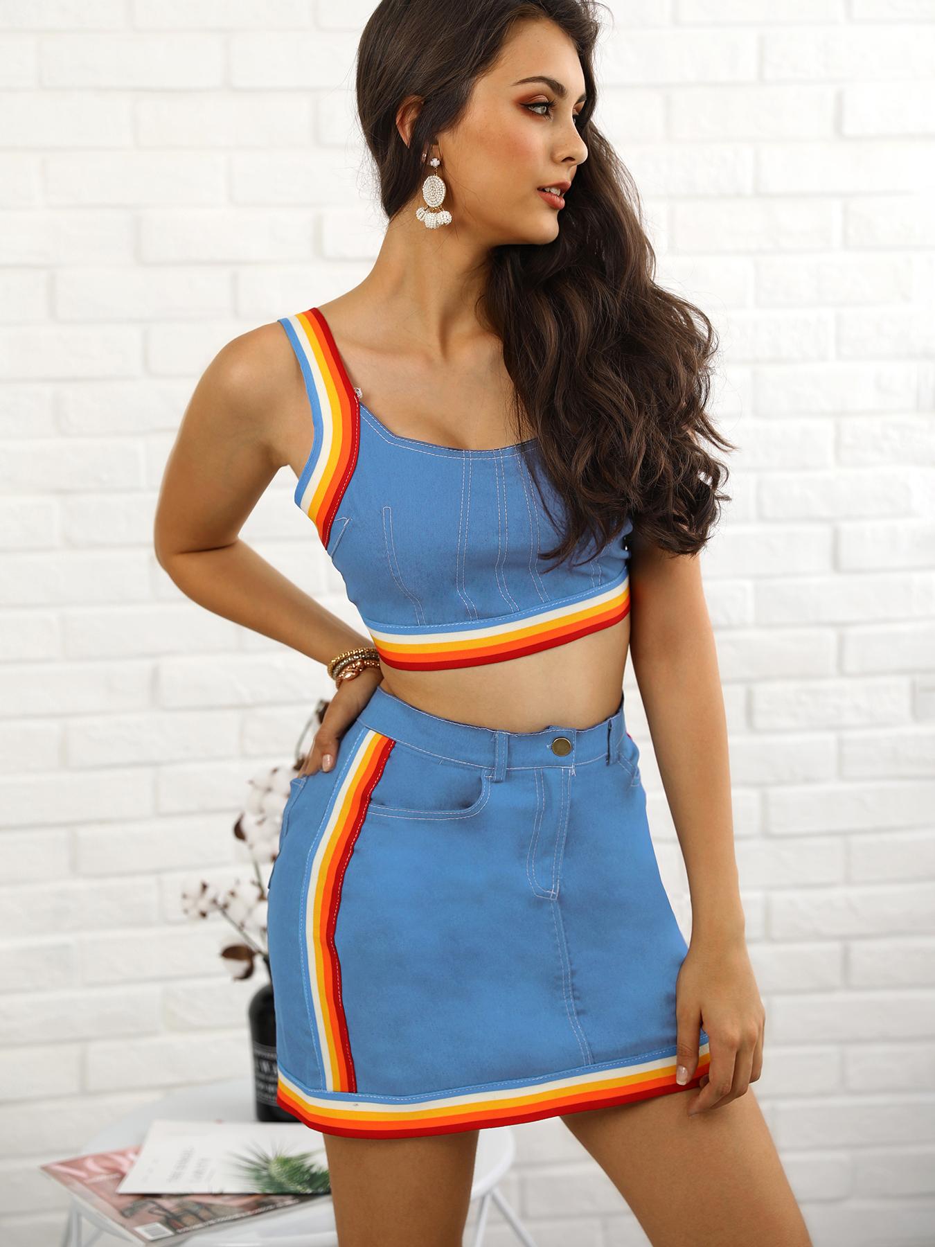 Colorful Striped Tape Denim Cami Top & Skirt Set