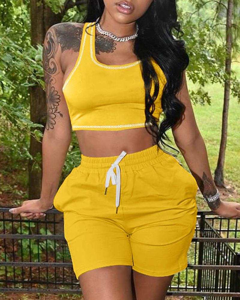 Contrast Stitching Crop Tank Top & Drawstring Shorts Set, Yellow
