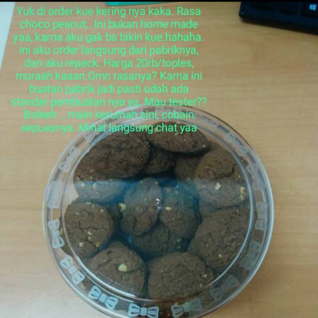 Yuk di order kue kering nya kaka. Rasa choco peanut.. Ini bukan home made yaa, karna aku gak bs bikin kue. Ini aku order langsung dari pabriknya, dan aku repack. Harga 20rb/toples. Toples yang di pakai adalah toples plastik bening 500gr