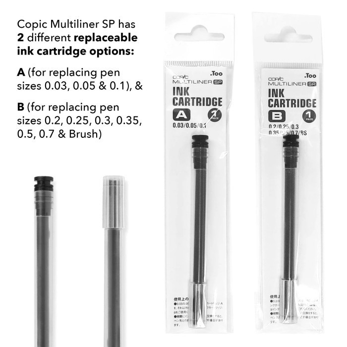 Catatan: Untuk mengganti kartrid pada pena Copic Multiliner SP, keluarkan kartrid lama dengan menariknya langsung keluar dari ujung belakang pena, lalu masukkan yang baru pada tempatnya.