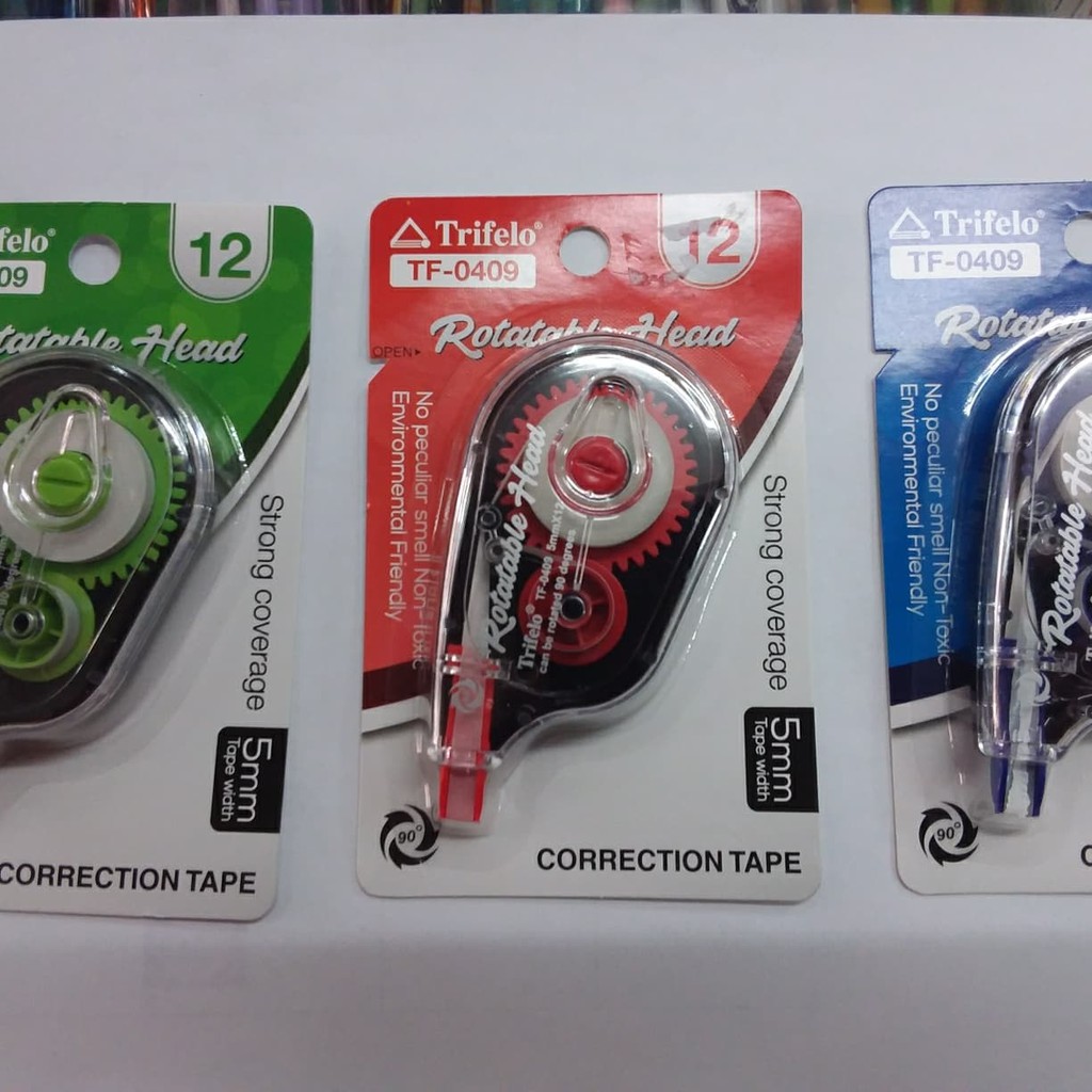 Correction Tape Trifelo TF-0409 adalah tip ex kertas dengan terobosan baru yang bisa diputar 90 derajat kepalanya dan disesuaikan dengan keinginan pemakai.Panjang tape : 5mm x 12mTersedia warna :- Merah- Biru- Hijau