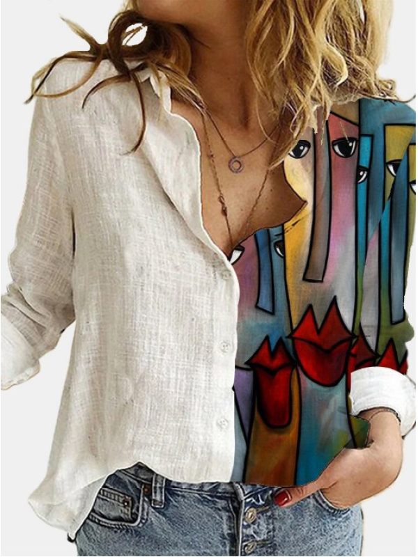 Cotton And Linen Striped Printed Long-sleeved Blouse