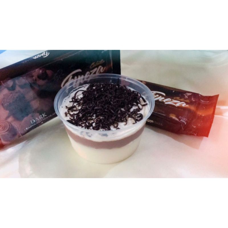 Pudding coklat yang di mix dengan jelly vanilla dan topping whipcream diatasnya serta parutan coklat.