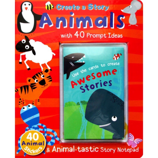Build a story book. Spark imagination with the help of flash cards and stickers to write an amazing animal story.