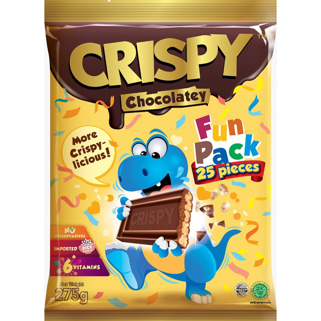 Diimpor dari Malaysia, yang di setiap incinya diisi dengan sereal beras Impor berkualitas dengan lapisan cokelat renyah yang diperkaya dengan nutrisi dan vitamin cocok sebagai makanan ringan untuk anak. Jutaan anak-anak, remaja dan kalangan muda sangat menyukai cokelat Crispy kami. Crispy, Crispy-Licious. Crispy memiliki 3 varian rasa, yaitu : Original, Orange, dan Strawberry.