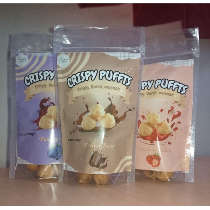 Crispy Puffs by Carya Rova adalah camilan istimewa berupa kue soes kering yang renyah dan gurih, tersedia dalam tiga varian rasa lezat: cokelat, stroberi, dan blueberry. Setiap gigitannya memberikan sensasi ringan dan renyah yang dipadukan dengan rasa manis yang pas, sempurna untuk dinikmati kapan saja.