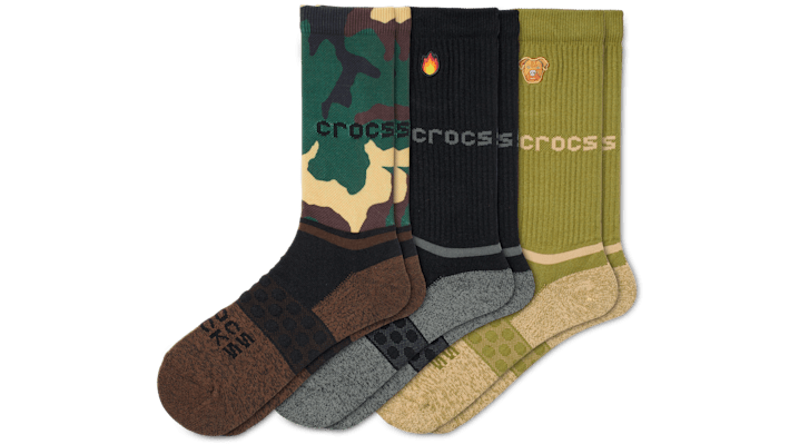 Be comfortable anywhere and everywhere in your own shoes—and now in your own Crocs Socks. Each pair has been engineered with high-quality elastic to help socks stay up, twisted and compacted yarn for improved durability, and a mesh arch band for fit and comfort. Plus, they’re a stylish addition to your everyday look whether you’re lounging or leveling up your favorite outfits. Go wild with this 3-pack by pairing them up or mixing and matching your socks style. Crocs Socks Adult Crew Graphic 3 Pack Details: 65.3% cotton, 19.3% nylon, 13.2% polyester, 2.2% elastane Machine Wash in 40 C / 104 F Avoid bleaching or ironing, tumble dry low Unique patterns and colors inspired by Crocs Classic shoes and Jibbitz™ charms Available in a variety of low, crew and quarter heights Includes three matching pairs
